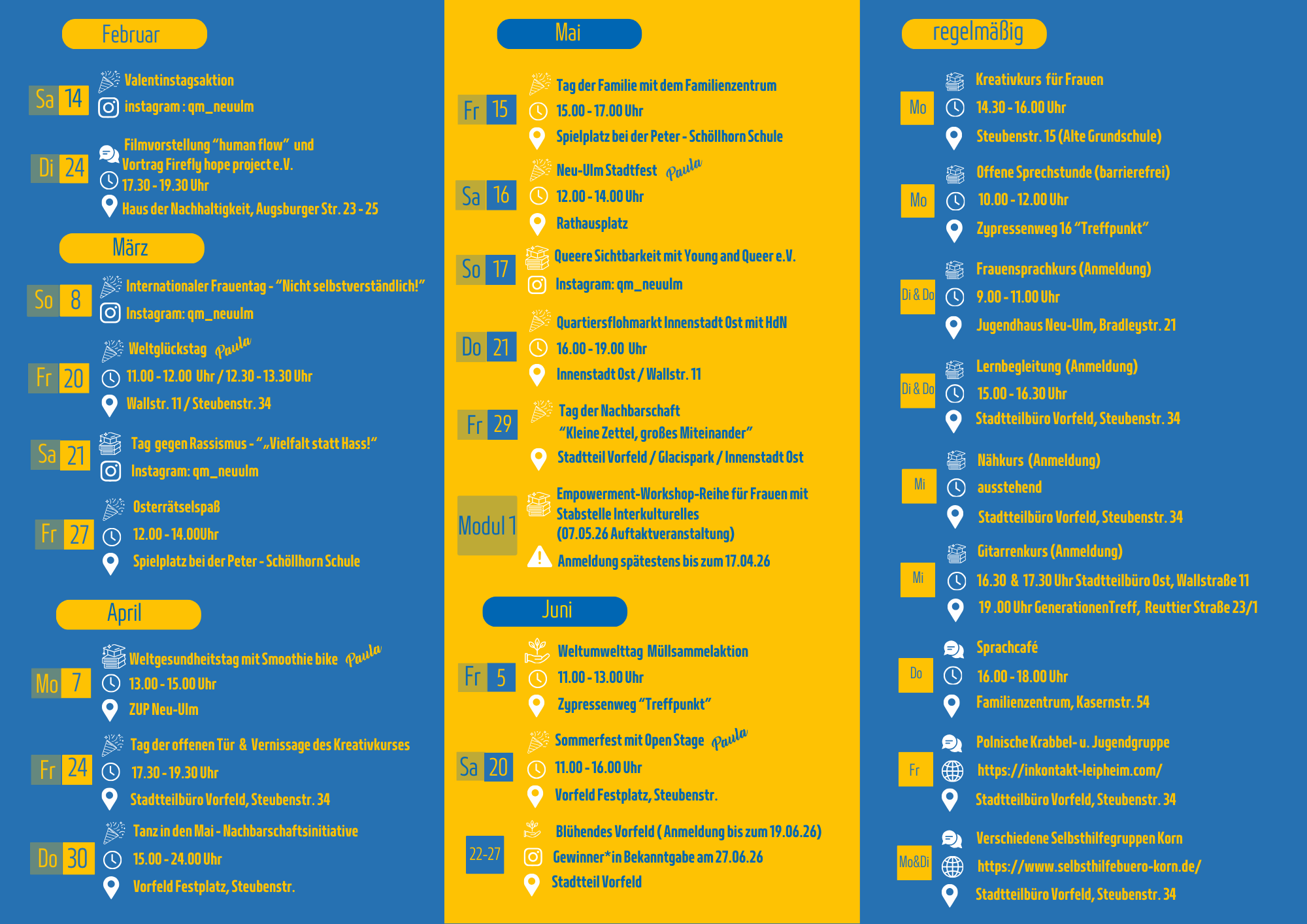Das Quartiersmanagement in Neu-Ulm gibt es seit Anfang der 2000er Jahre und leistet seit dem zahlreiche Angebote in verschiedenen Bereichen. Dazu gehören: